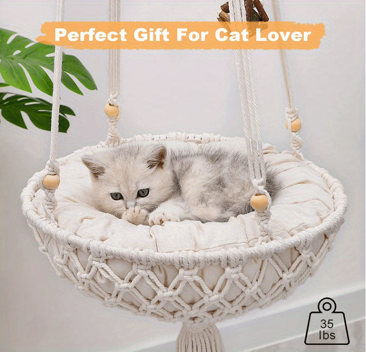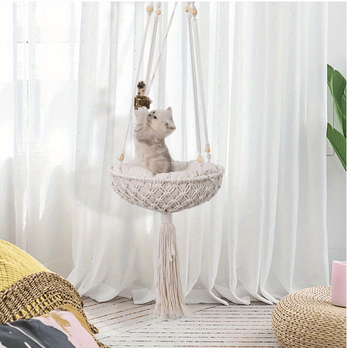 Macrame Cat Bed Hammock: Unique design bohemian-style cat swing bed, Hand-woven just for your cat to hang out in the house also, can be proudly displayed to friends and guests as their adorable cat sleeps on a woven cat bed basket can be a beautiful macrame boho wall art.
