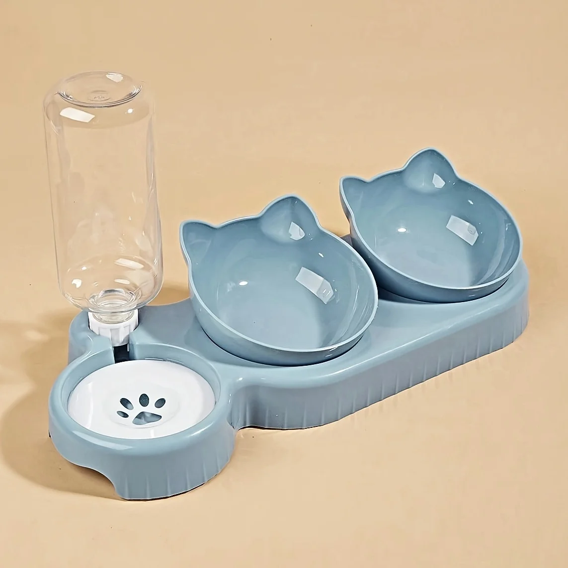 Pet Bowls With Water Feeder, 3 In 1 Ear Design Tilted Cat Water And Food Bowl Set With Gravity Water Bottle For Neck Protection